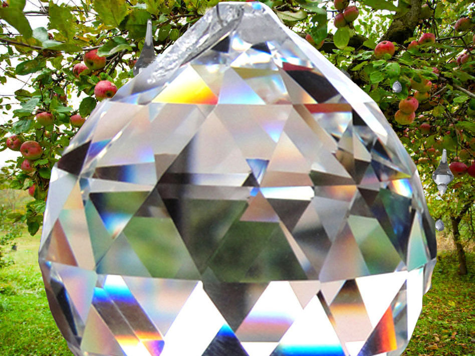 In full bloom with apples, the tree is covered in hanging crystals that shimmer in the light and that appear like raindrops in suspension. The birdsong that exists in the